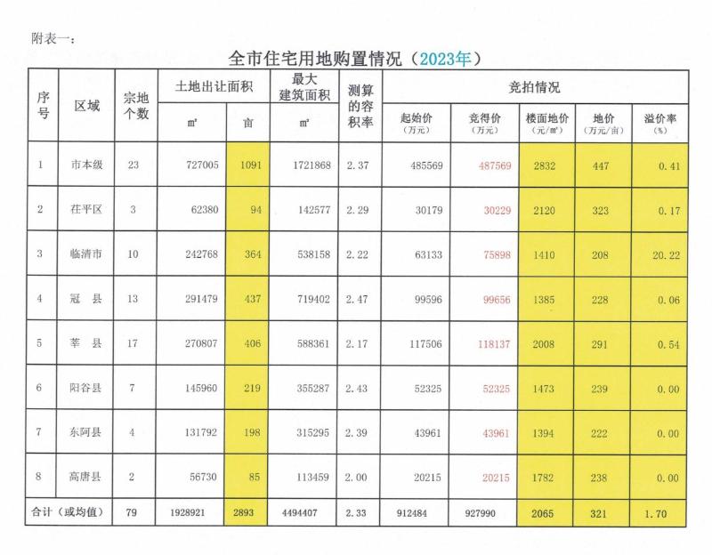 附表一:全市住宅用地购置情况(2023年)