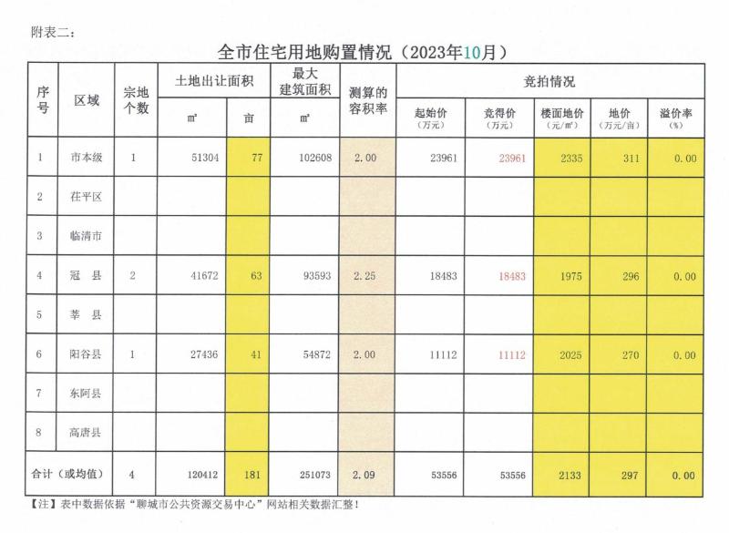 附表二:全市住宅用地购置情况(2023年10月)