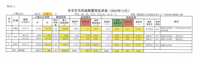 附表三:全市住宅用地购置情况详表(2023年10月)