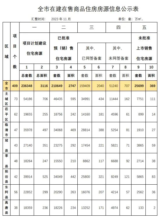 截至2023年11月底,全市房地产商业开发在建在售住宅项目共409个,计划新建商品住房236348套、面积3116万㎡