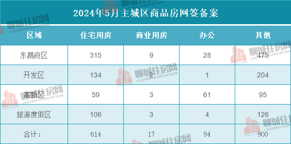 区域网签数据来看,5月份的网签量东昌府区位列第一,共505套,其中住宅用房网签201套,商业用房20套,办公31套,其他253套;旅游度假区位居第二,共469套,其中住宅用房182套,商业用房13套,办公3套,其他271套;第三名开发区,共计374套其中住宅用房121套,商业用房5套,办公16套,其他232套第四名为高新,共108套,其中住宅用房34套,商业用房1套,办公3套,其他70套;最后其他地区共2套,分别是住宅用房和商业用房各一套